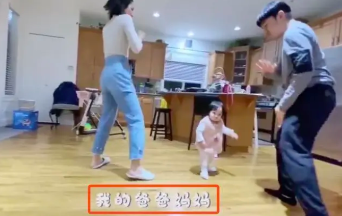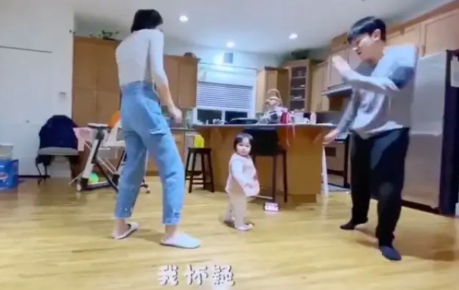视频中,王祖蓝和妻子李亚男一起跳舞,一岁多女儿在一旁呆呆看着。