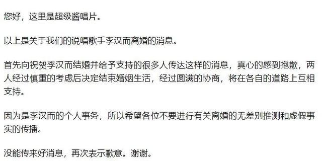 但李汉而通过经纪公司表示,“经过圆满的协商后,已经完成了离婚过程”,经纪公司方面也表示两人是经过慎重考虑,最终决定结束婚姻生活,并且补充道:“因为这是李汉而个人的事情,所以希望大家不要盲目猜测离婚和散布虚假事实”,言下之意,李汉而离婚是私事,原因不予公布。
