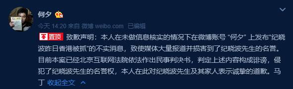 2月24日,针对纪晓波先生诽谤内容的名誉权纠纷案胜诉,曾造谣“纪晓波在香港被抓”一事的被告人在微博首页置顶位置向纪晓波先生公开致歉。