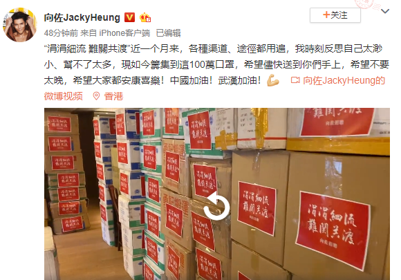 2月24日,向佐分享了一段视频,并配文:“涓涓细流,难关共渡”近一个月来,各种渠道、途径都用遍,我时刻反思自己太渺小、帮不了太多,现如今筹集到这100万口罩,希望尽快送到你们手上,希望不要太晚,希望大家都安康喜乐!中国加油!武汉加油!”