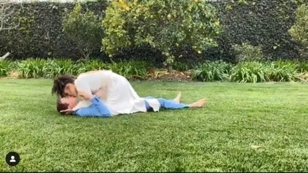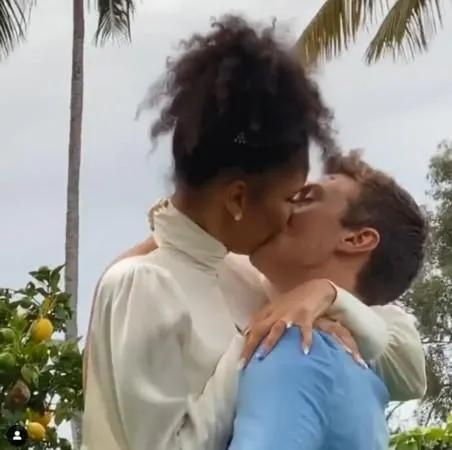 而他的妻子则是一身白色的小礼裙,二人激动之下,热情拥吻,还当众躺倒在草皮上热吻,引来围观的好朋友一阵阵起哄。