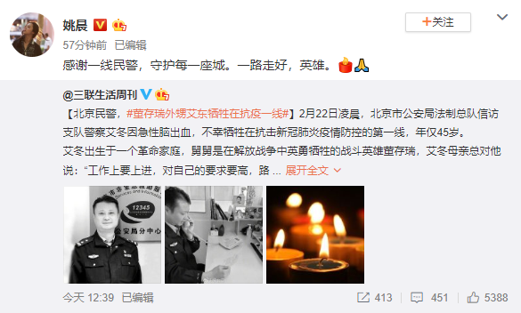 2月24日,姚晨转发媒体报道的关于“北京民警董存瑞外甥艾东牺牲在抗疫一线”的新闻,并发文表示敬意:“感谢一线民警,守护每一座城。一路走好,英雄。”