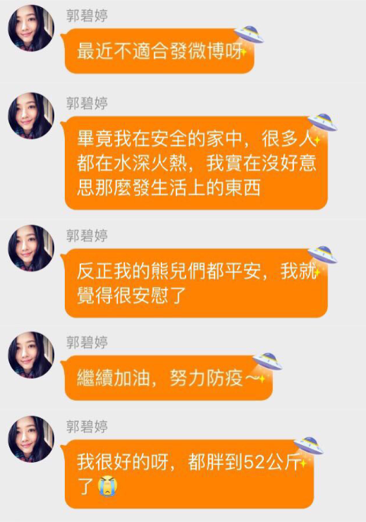 郭碧婷还分享了自己的近况,她已经胖到了52公斤了,也非常想念粉丝,只是最近不适合发微博,等以后有机会了会分享她的生活方式,非常宠粉。