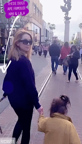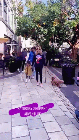 姑姑一手牵着两只狗狗,一手牵着Alaia,期间还不停看Alaia有没有乖乖听话,Alaia牵着姑姑的手,再加上穿着这身衣服,这个造型,走在街上就是最靓的仔,超帅的小公主。