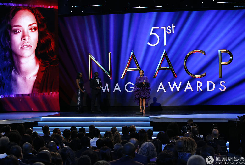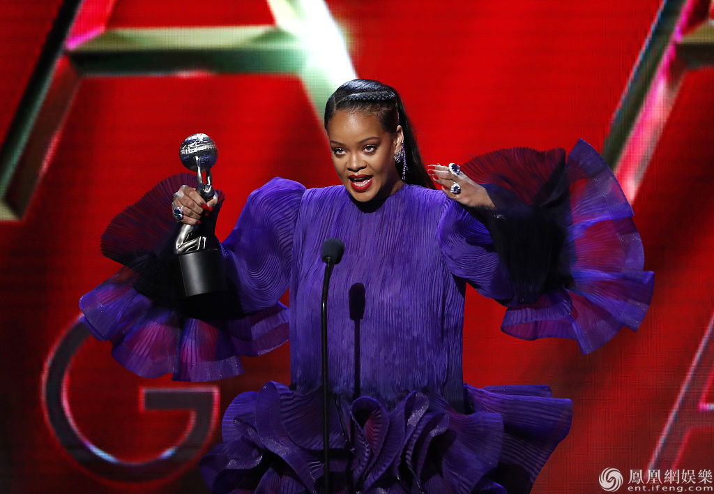 当地时间2020年2月22日,加州,第51届全国有色人种促进协会大奖( the 51st NAACP Image Awards)现场。“惊奇队长”布丽·拉尔森(Brie Larson)与迈克尔·B·乔丹携手颁奖。蕾哈娜获得特别成就奖“总统奖(President’s Award),她身穿紫色荷瓣礼服现身秀奖