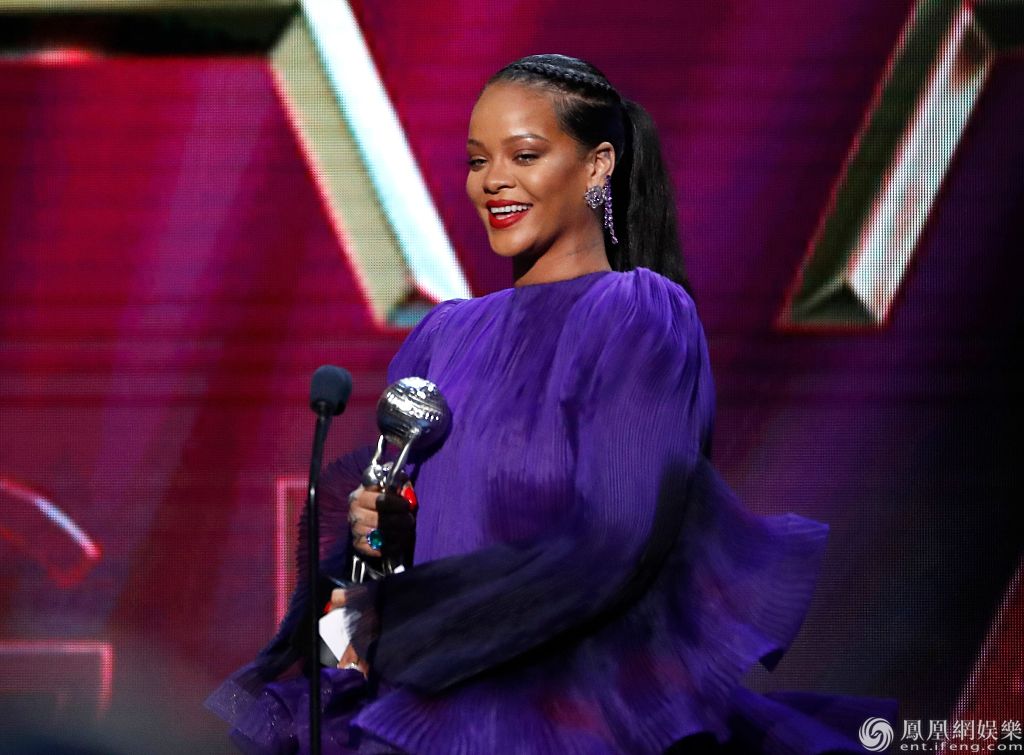 蕾哈娜身穿紫色荷瓣礼服现身秀奖杯。