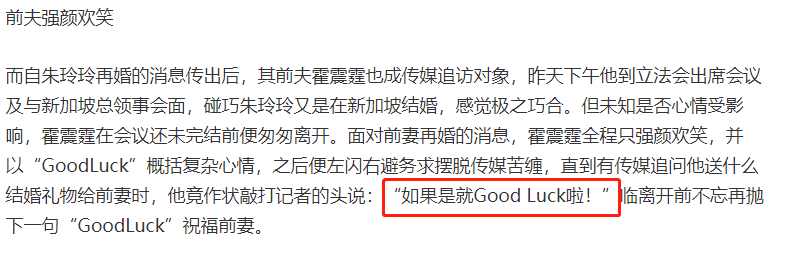 对此,霍也看的开,以一句“Good Luck”祝福前妻。