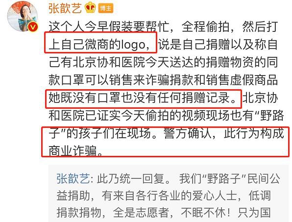 或许是害怕夫妇两人的怒气被大家误解,而后,张歆艺还发出长文,对这一造假事件做出了清晰的解释。她说,声称来帮忙的人没有口罩,也没有任何捐赠记录。而这些微商,在北京协和医院拍摄了大量的捐赠视频,包括野路子组织的物资。