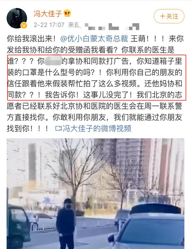 果不其然,引来了上图中冯大佳子的质疑,他发文怒骂:你联系的医生是谁?你拿协和同款打广告,你知道箱子里装的口罩是什么型号的吗?言下质疑,就是这位拍视频的女士假装来给北京志愿者帮忙,实际是为了拍摄视频,给自己卖的口罩打广告,冒充协和同款卖高价。
