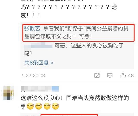 据张歆艺声称,拍摄视频的人,是拿着她们“野路子”民间公益捐赠的货品,掉包牟取不义之财。引得网友们纷纷怒斥:这些人的良心被狗吃了吗?而张歆艺则显得更加愤怒,在评论区痛骂微商:简直是猪狗不如!
