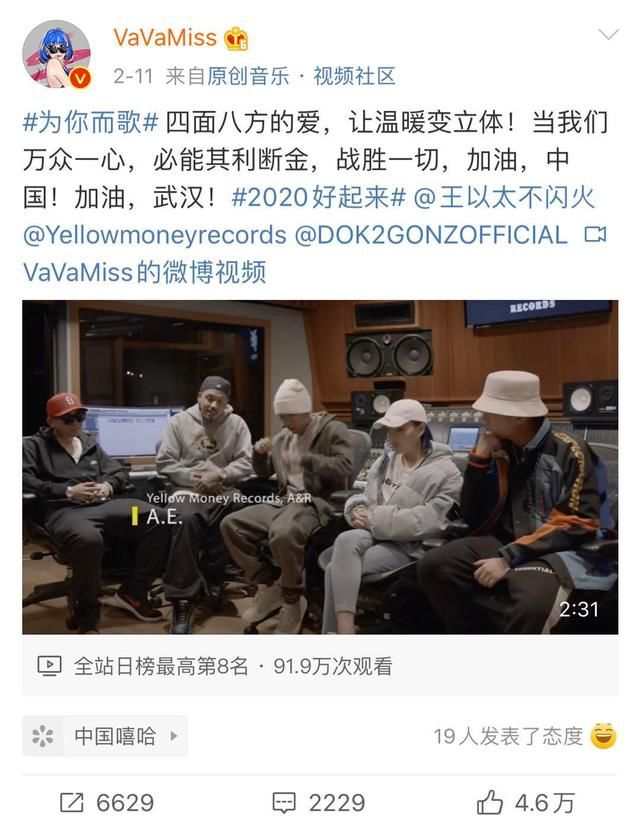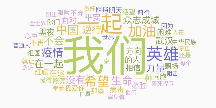 文|远木 “看这一次,中华儿女不会低下头。” 在前不久的央视元宵晚会上,宝石Gem与玲花、石头、郑棋元共同对唱了一首抗疫歌曲《出征》,这首气势磅礴的歌,令宝石老舅吸粉无数,在各大音乐平台上,底下也是好评无数。 歌词中引用文天祥、岳飞等经典诗词句,将中华儿女比作英勇战士,整首歌表现的节奏感和韵律也很强,更容易表现出燃点,有网友评论,“从未想过有一天听说唱能听哭。” 抗疫歌曲走红: 偶然中的必然 自疫情爆发以来,诸多抗疫歌曲也就势而生。其中,像《出征》这样类似的歌曲接连出圈,同名MV也在前不久的QQ音乐的内地巅峰榜跃升至第五。 最近,能够看到不少抗疫歌曲是在卫视上的晚会、音乐综艺“露面”走红,歌曲再被网易云音乐等音乐平台收录,诸多歌曲能从卫视到互联网平台形成闭环,进而获得更广泛的受众。 毕竟,在疫情发生以来,在不断负面新闻的浸淫之下,大众总会有相应负面情绪的发泄需求,而音乐内容创作者利用适合的时机,通过对武汉素材的二次利用,加上个人化的创作风格,也让大众感受到不同特色。 先是音乐人队。如宝石老舅的直爽、隔壁老樊的温暖、伪佛Weaver的真诚……而这些也能够从粉丝评论中窥见,音乐人所唱的《明天会好的》、《武汉伢》等歌曲在此前也接连出圈。 出圈的背后,也是不同年龄段、不同风格的音乐人,通过歌曲,来展示对疫情的不同理解和想法。 而另一边的明星队,从一开始林俊杰的《stay with you》、邓紫棋推出的《平凡天使》、李荣浩的《同根》等,一上线就有几十万次转发,歌词主要是致敬武汉前线人员,也让乐迷感受到唱作人的诚意。 另外值得注意的是,在歌曲类型固定的前提下,不同音乐人的合作也是亮点。比如朱一龙、李现与常石磊、黄嘉琪合唱的《武汉,你好吗》;谢霆锋、王俊凯、萧敬腾合唱的《保重》,其中,“歌颂”、“英雄”、“重逢”是经常出现的关键词,有人评论,“我的偶像依然没有让我失望”。 一个有意思的现象是,由于旋律、节奏或歌词适合,部分音乐人在发生疫情之前创作的歌曲,也被用来经过二次改编后成为“新”的抗疫歌曲,对疫情也是一种应景。 比如毛不易此前推出过的歌曲《无问》、《借》、《一荤一素》,因为旋律质朴走心,也在疫情期间被网友进行歌词改编以后当作加油歌曲,所歌颂的也是疫情之下医护人员、善良的普通人等。 无独有偶,音乐人阿冗的《你的答案》,原本是抒发个人低谷期的心情之作,在歌词被改编之后,也被用来当作各种抗疫MV的背景音乐,警察版、前线人员版、基层干部版本等层出不穷,可谓是天衣无缝。 此外,还有国外队,比如四位中韩Rapper联手推出的《Life Is Beautiful》,歌曲海报上四位不同颜色的手握在一起,也象征着作为音乐人、跨国别、跨地域对中国的鼓励。 在看过不少抗疫歌曲之后,整体来看,随着抗疫歌曲数量的增多,也避免不了在制作上的同质化问题,纵观疫情期间的歌曲,除了头部音乐人会形成稳定的个人化风格之外,普遍的抗疫歌曲,尤其是在视频上,也避免不了雷同化。 大多数歌曲所采用的剪辑视频,都是前线医生在医院奋战、或相关专家、医护人员采访的网络片段,关于普通前线医护人员的爱情、亲情、友情等社交场景不时出现,彼此的重复性也很高。 影响力考量: “英雄”成为关键词 一个月以来的抗疫歌曲中,有常见的主旋律式慢性抒情,有能抒发个人情绪的Rap,形式上,有个人独唱,也有群星、音乐人的“云”集合演唱。 根据创作者的类型不同,歌曲也有分野,若是官方机构推出的公益歌曲,话语体系上就更注重“英雄”、“温暖”、“伟大”等伟光正表述,主旋律形式更加明显。 相比之下,独立音乐人的表达则比较自由,以普通人的视角直抒胸臆,比如《武汉会好的》、《武汉伢》等,歌词也更加口语与随意,尤其是一些说唱类歌曲,思想表达也更直接。 抗疫歌曲不仅是个人的表达,也反映出时代的表达,我们在选取《守护》、《明天会好的》、《黑夜一束光》、《武汉加油》等多个平台近30首抗疫歌曲之后,产生的词云图如下: 先去掉“我们”、“一起”这样的无意义词汇,“英雄”、“加油”成为最多的词汇,落点也在于团结性上,同样也是每个普通人话语权与舆论地位的体现,比如在歌词表达上,有的侧重对一线医护人员的歌颂,有的侧重对湖北人民的关切,总体看来,还是乐观、积极的词汇占据主流。 不完全统计,从一众抗疫歌曲所表达的歌词意图、风格形式等看来,基本能分成两种类型: 1.抒情类,歌曲的对象紧紧围绕疫情相关的前线人员,比如韩红、去世的李文亮医生等,表达对其的尊敬与敬佩,整体基调也比较悲伤、低沉,属于催泪的一种,能在短期内与热点结合,时效性强。 2.提振类,此类多半以说唱形式为主,“英雄”,“热血”、“挺身而出”、“肩负重任”成为高频词,传唱度也更强,连网易云音乐官方还推出了说唱歌曲《我们一起守护》,安慰和鼓励前线人员,加上如今的“连降”与复工趋势,这类歌曲呈现出的乐观精神在现在比较应景,也更容易引发传播,持久性更强。 个别也会突出地域性。歌名、歌词也常出现“武汉”、“黄冈”等疫情高发城市关键词,也会提及武汉一些代表性元素如热干面、黄鹤楼等。 相比过去公益歌曲,如今的抗疫歌曲则普遍使用年轻人更容易接受的表达形式,除了传统的卫视之