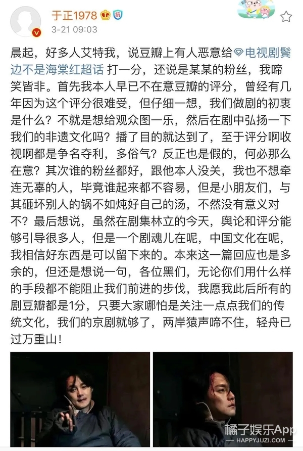 这样一来就有点浪费于正前期的营销,黄晓明居然演耽改剧,喷余少群吹尹正,以及播出后反响不如意发微博暗讽是因为某流量粉丝打一星所致。