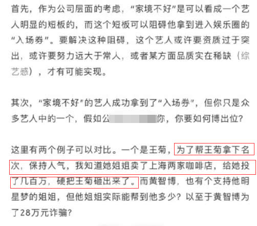 日前,网上流传着一篇自称是偶像公司老板所写的文章,文章内容则是谈老板会如何挑选新人,作者表示家境平凡的偶像出道十分艰难,“家境不好”成为了当下艺人明显的短板。这位所谓的偶像公司老板还透露王菊的姐姐为了帮王菊拿下名次、保持人气,卖掉了上海两家咖啡店,给王菊砸了几百万送她出