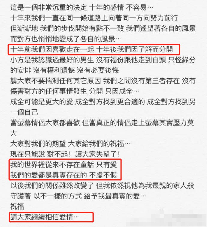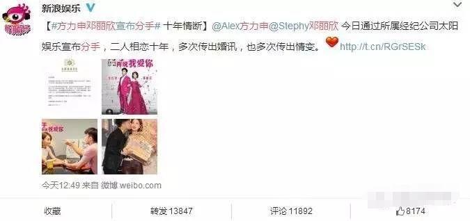 关于分手邓丽欣感慨“十年前我们因喜欢走在一起,十年后我们因了解而分开”。