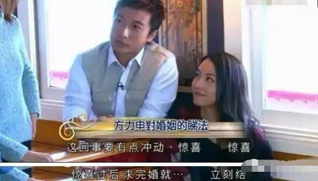在王祖蓝主持的《蜜月到访》中,方力申被问到“为什么交往这么久还不结婚”,他的回答是“不要计划好的求婚,想要有冲动、激情和惊喜”,可是恋爱十年了哪还有什么冲动。