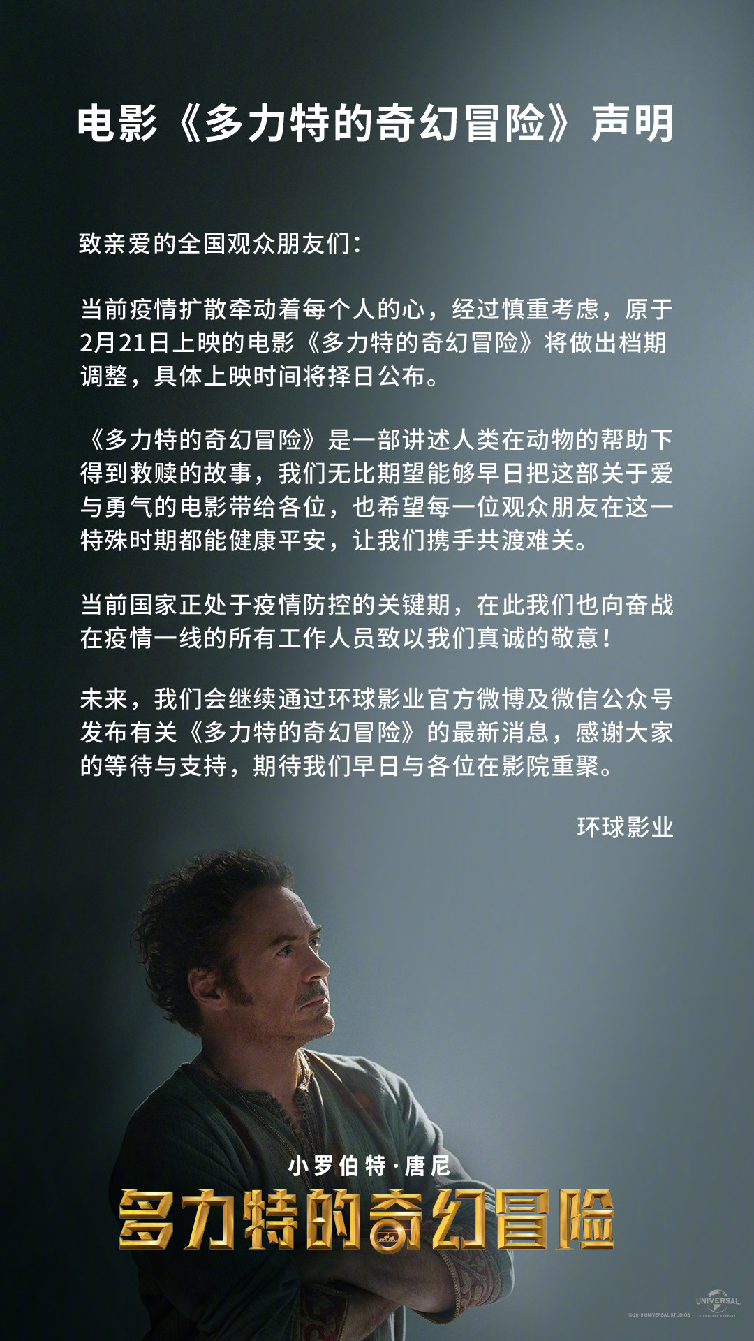 2月17日,小罗伯特·唐尼主演的合家欢冒险片《多力特的奇幻冒险》宣布撤掉原定2月21日上映的中国内地档期。影片仍计划在内地上映,新档期尚未确定。