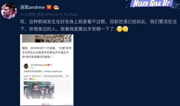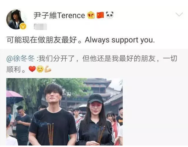 然而在19年8月份,徐冬冬发文宣布恋情告终,她称:“我们分开了,但他还是我最好的朋友,一切顺利。”尹子维则转发回复称:“可能现在做朋友最好,Always support you。”