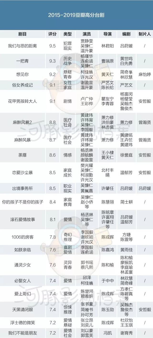 小娱整理了2015-2019年部分在豆瓣上广受好评的台剧。这张表格里的大部分作品在服化道、特效上着实不算特别精致,但胜在题材和立意十分值得推敲。