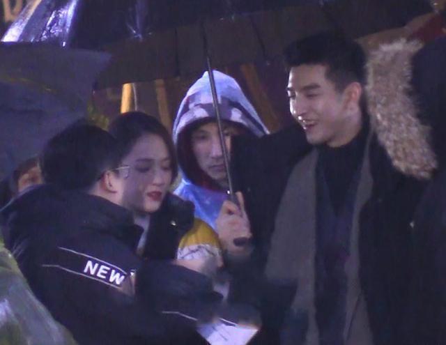 对完了台词,两人准备先彩排走一下流程,金行手里拿着伞,在雨中为陈乔恩撑着,男友力max,金瀚笑容满面,陈乔恩有点羞涩。
