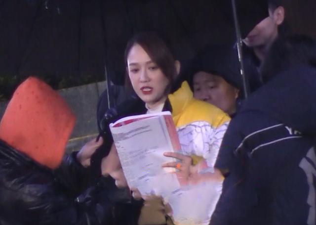 陈乔恩身穿黄色的棉服,手里拿着剧本在读,旁边有造型师帮忙整理发型,陈乔恩相当认真,趁着这个空挡不停的翻看。
