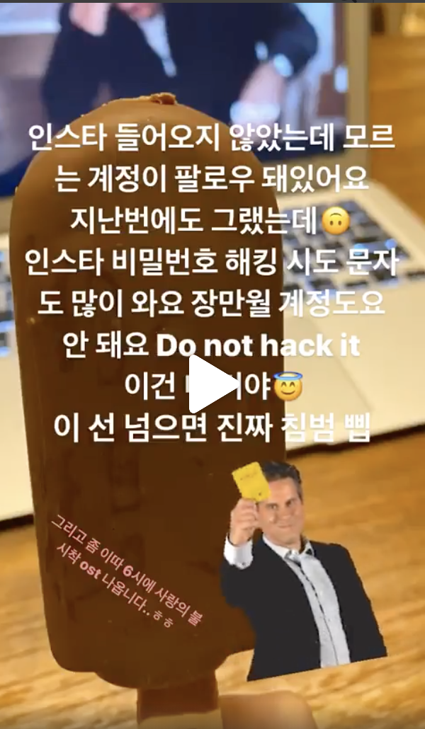 IU表示,“张满月”的社交账号曾经也遭到黑客攻击(张满月是tvN电视剧《德鲁纳酒店》中的角色,IU亲自制作并运营SNS账号)。她还出“黄牌”警告那些打她账号主意的不法分子:这是我的东西,do not hack it(不要越过这条线)。