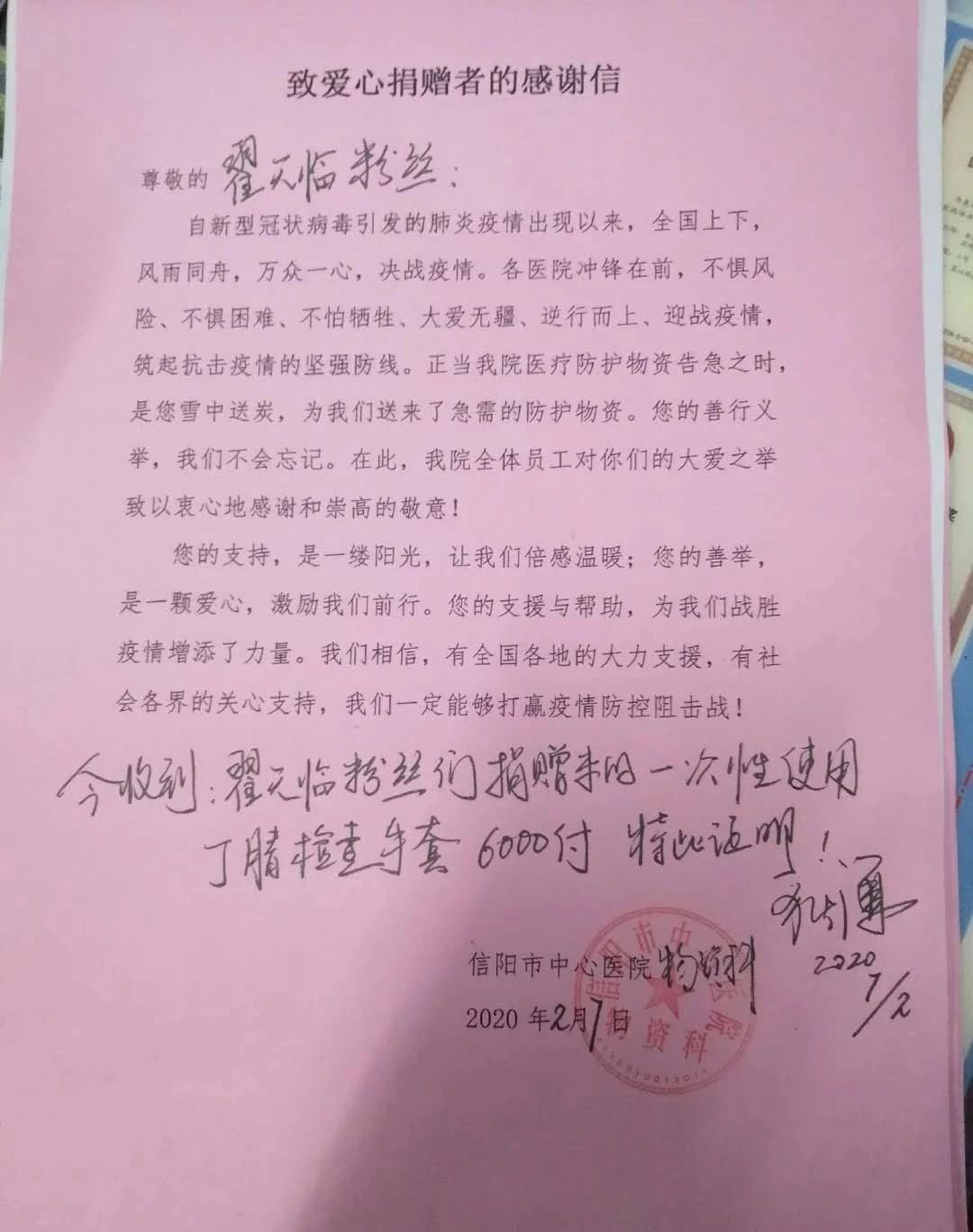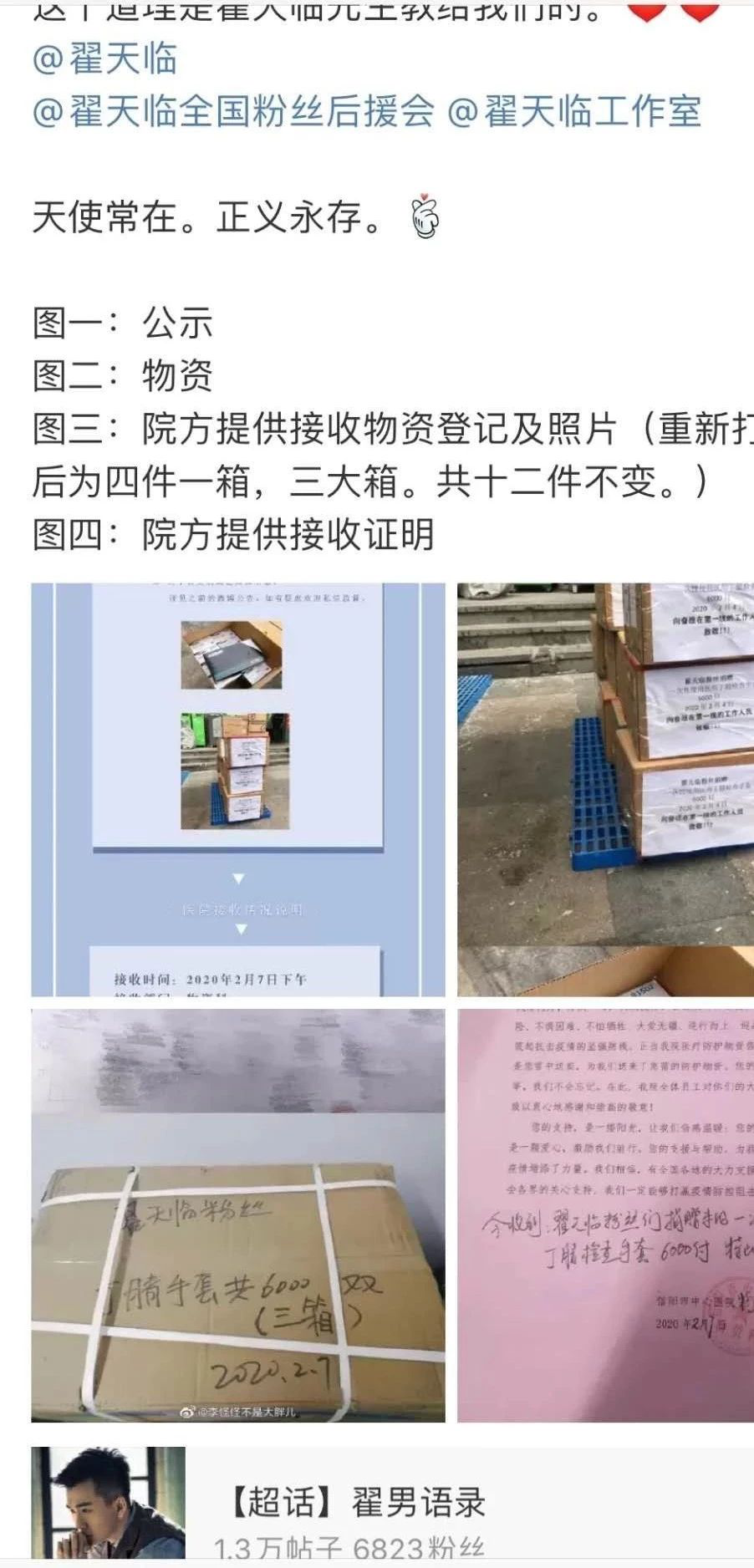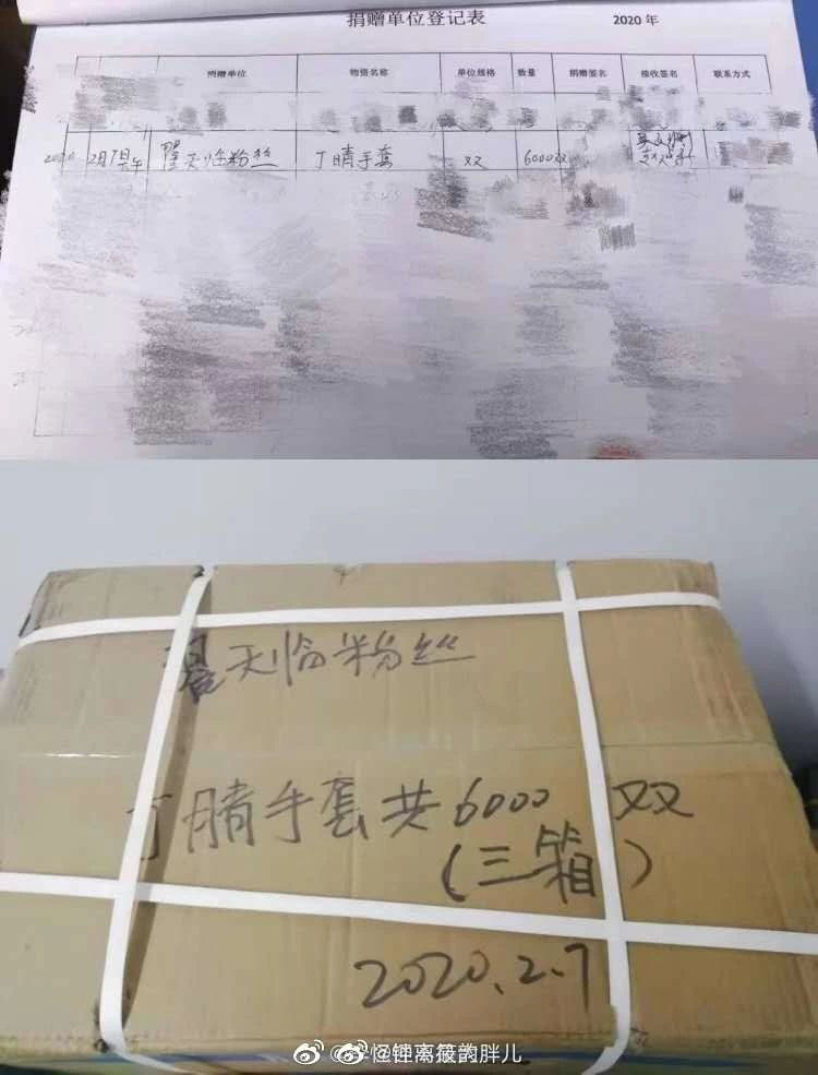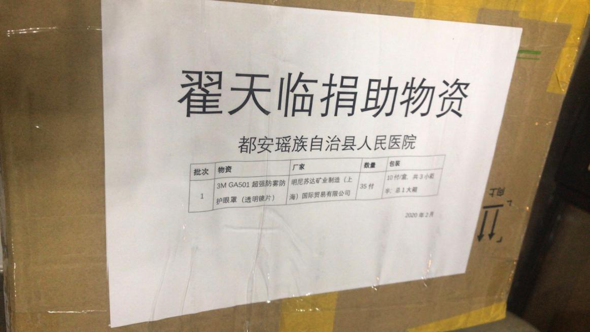 从疫区接收到的物资中,也能看到翟天临的名字。