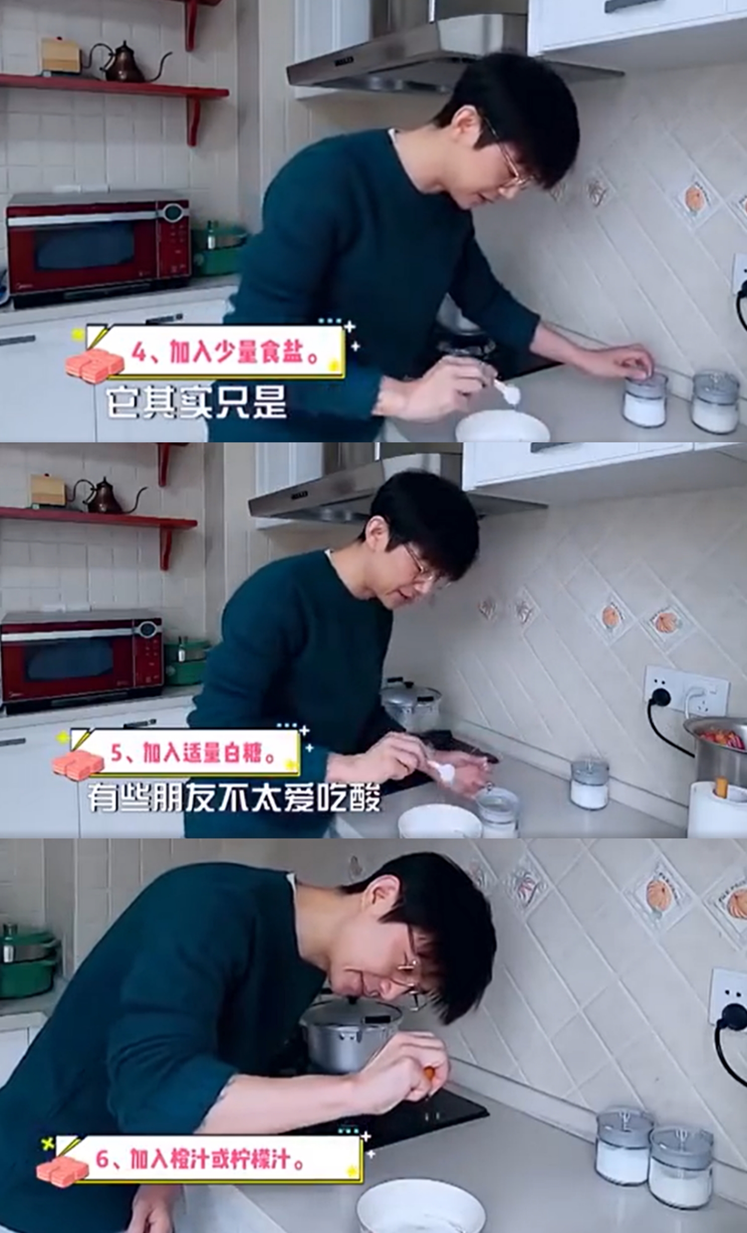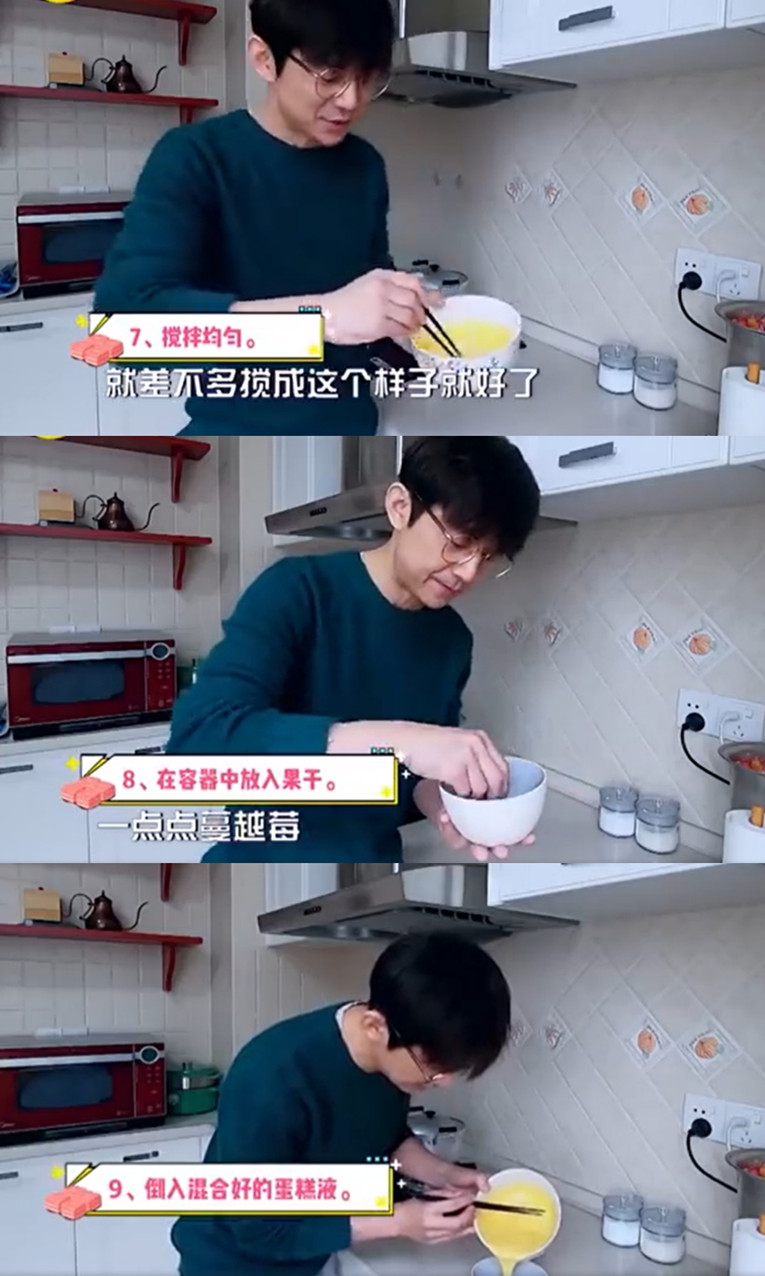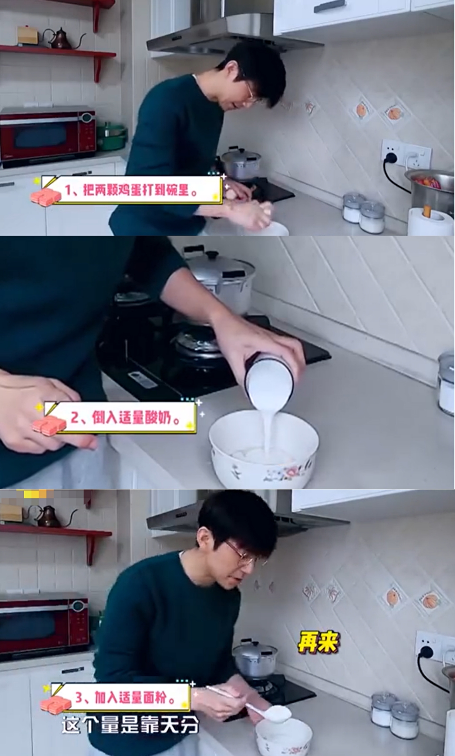 何炅的“超级酸甜小蛋糕”用料十分简单,依次放入鸡蛋、酸奶、面粉。