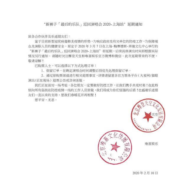 2月11日,摩登天空官方发布新裤子“最后的乐队”巡回演唱会2020上海站延期通知,表示:“鉴于目前新型冠状病毒肺炎疫情的形势,原定于2020年3月7日在上海·梅赛德斯-奔驰文化中心举行的上海站将延期,后续具体演出时间将根据实际情况另行通知。各位朋友一定要做好防控工作,让我们携手共克时艰!在此特别向所有奋战在防控疫情一线的工作人员致敬,也感谢乐迷朋友们一直以来的支持,愿我们春暖花开再相聚!”